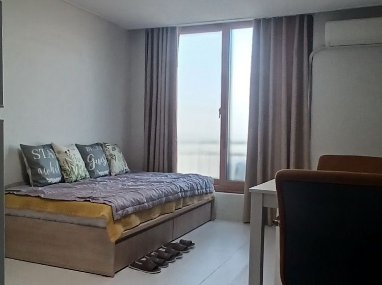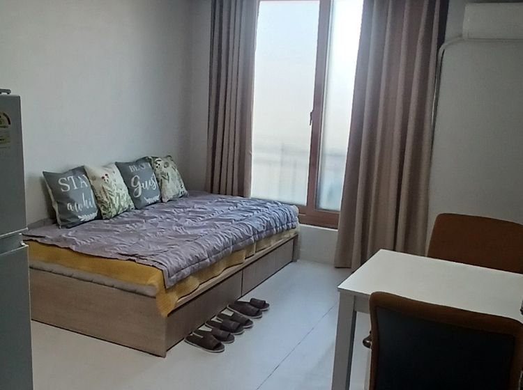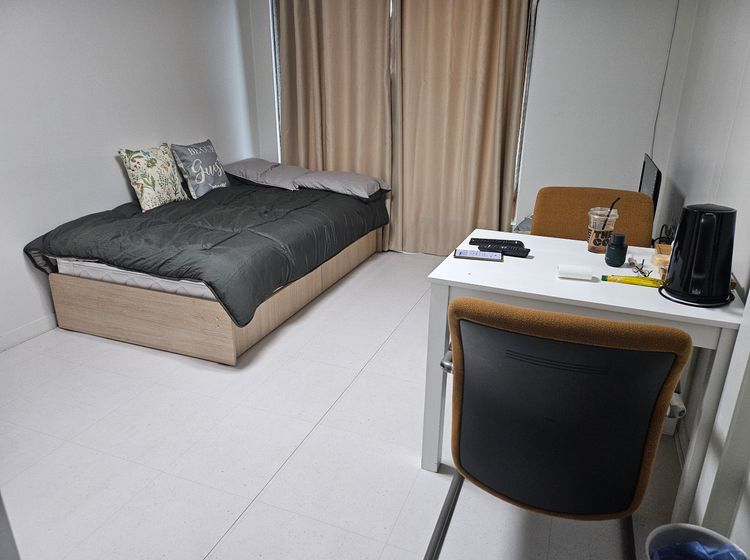 마을버스정류장앞 대로변입니다. 침대와 작은 쇼파 테이블 갖춘 아늑한방입니다