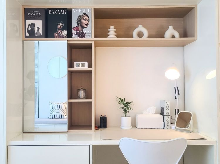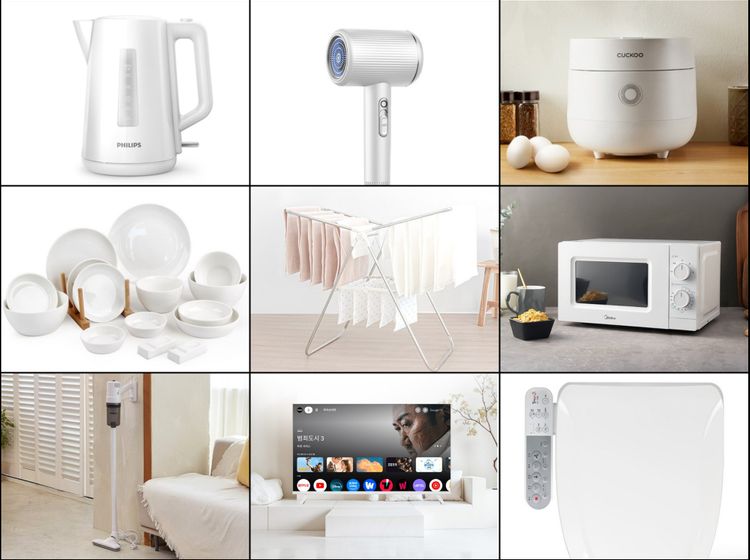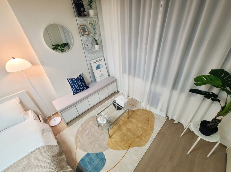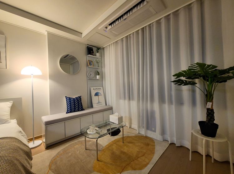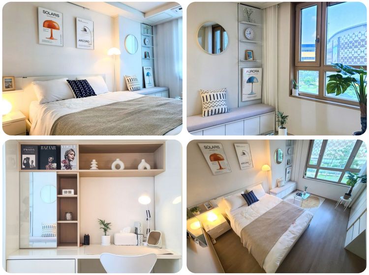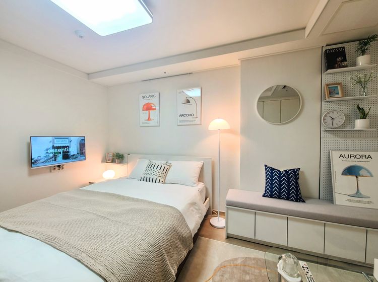 스마트TV(다양한 OTT), LG트롬 세탁기(건조가능), 시스템에어컨, 보일러(온돌), 청소기, 환풍기, 퀸 침대 (150x200 cm), 벤치소파, 소파테이블, 협탁, 의자2, 책상 및 화장대, 스톤 오일 디퓨져