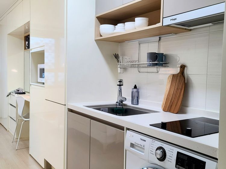 삼성 빌트인 냉장고, 전기밥솥, 전자렌지, 전기포트, 2구 인덕션, 주방 환풍기, 한식기세트 20P 이상, 수저세트, 국자, 뒤집게, 칼세트, 가위, 머그컵, 유리컵, 냄비/팬 세트, 스텐 채망, 세척볼(대) 등 바로 생활 가능
